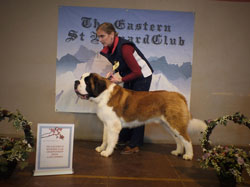 I was very pleased with my main winners who were all good representatives of the breed. Overall presentation was good but quite a few dogs would benefit from having their nails cut. The Standard calls for large compact well arched toes and this picture is spoilt by long nails. Another point to watch on feet is a tendency towards flat feet. Movement on the whole continues to improve as do mouths, teeth of good size only one overshot bite. Eyes whilst not showing the amount of haw of old, too many exhibits had loose fitting eyelids. The Standard states that eyelids should be reasonably tight, this is a point that certainly needs addressing.